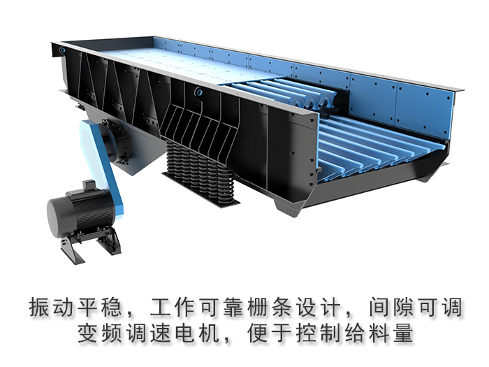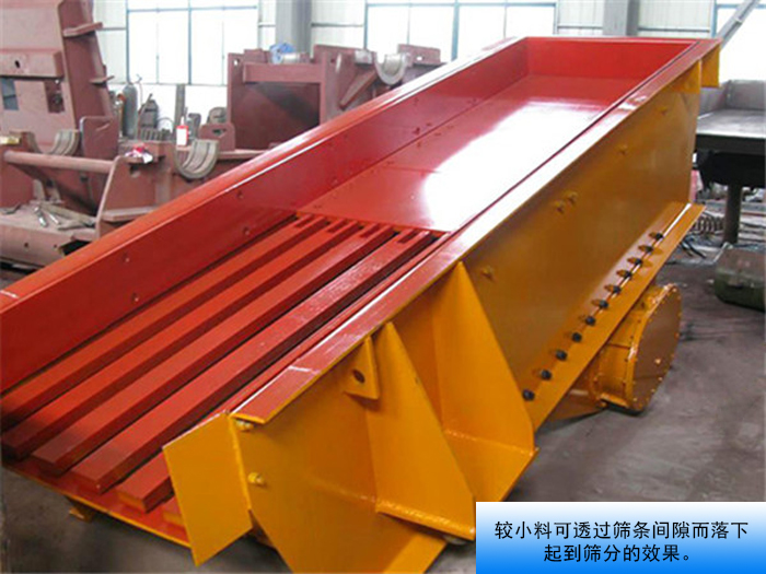 當(dāng)物料通過槽體上的篩條時,較小料可透過篩條間隙而落下,不經(jīng)過下道的破碎工序,起到篩分的效果。