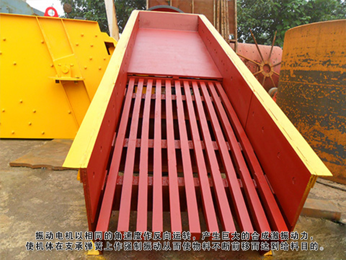 主要由一對性能參數(shù)完全相同的振動電機(jī)為激振源,當(dāng)兩臺振動電機(jī)以相同的角速度作反向運轉(zhuǎn)時,其偏心塊所產(chǎn)生的慣性力在特定的相位重復(fù)疊加或抵消。從而產(chǎn)生巨大的合成激振動力,使機(jī)體在支承彈簧上作強(qiáng)制振動,并以此振動為動力,帶動物料在料槽上作滑動及拋擲運動,從而使物料不斷前移而達(dá)到給料目的。