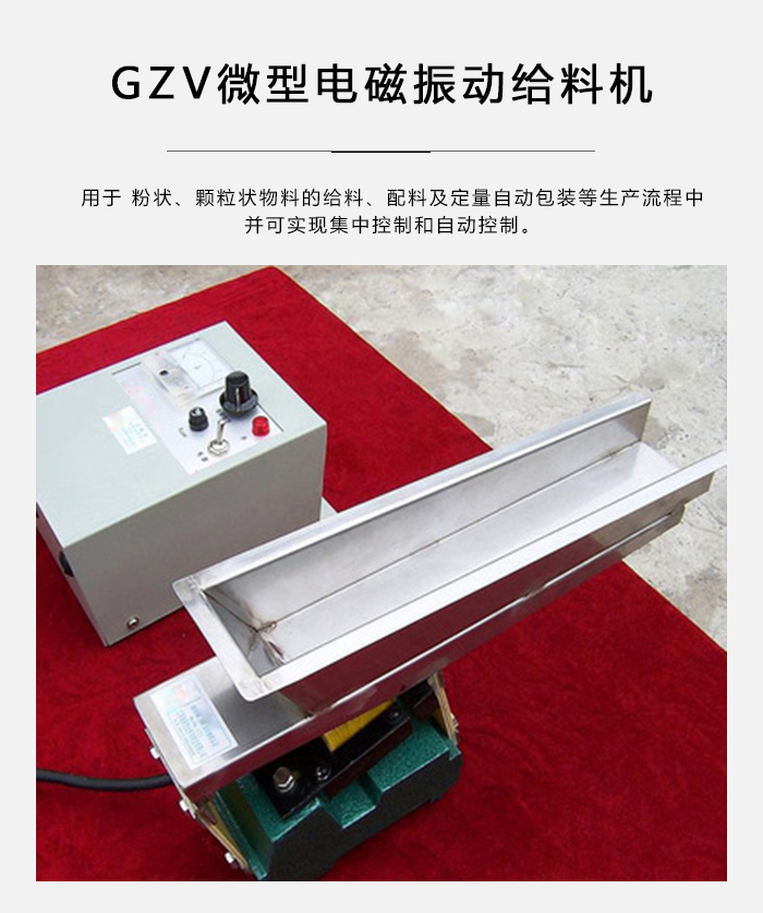 GZV微型電磁振動給料機廣泛應用于輕工、化工、糧食加工、商業等行業,用于粉狀、顆料狀物料的給料、配料及定量自動包裝等生產流程中,并可實現集中控制和自動控制。
