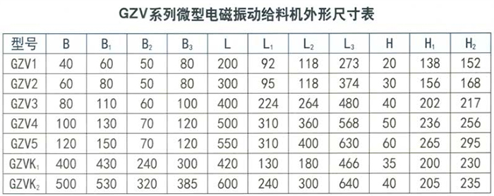 注:GZV微型電磁振動給料機一共有七種規格,包含GZVK微型電磁振動給料機兩種規格,它是在GZV型號的基礎上,根據用戶的要求而開發的新型產品。它不僅具有GZV的性能和特點,其結構和原理也都一樣,而且生產能力大給料均勻平穩。