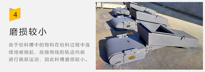 5、由于給料槽中的物料在給料過程中連續地被拋起,按拋物線的軌跡向前進行跳躍運動,因此給料槽的磨損較小;
